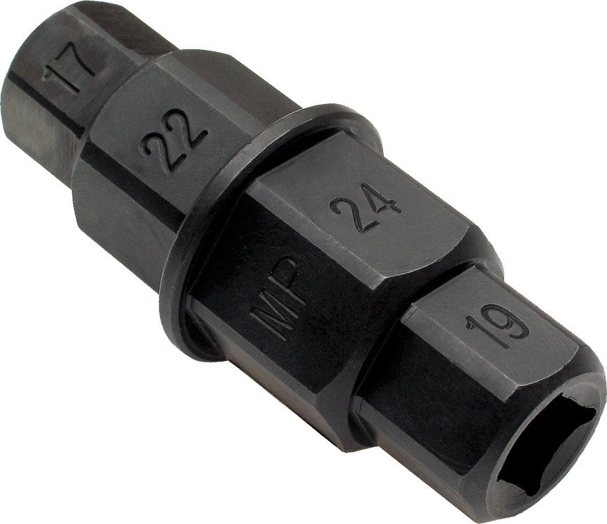 For hex axle removal on many late model sportbike applications Four metric hex sizes: 17,19, 22, and 24mm 3/8” square drive on both ends