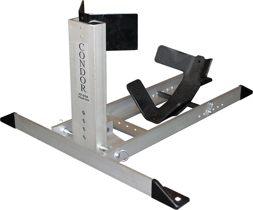 Make your life easier with the Pit Stop/Trailer Stop. Just place it in your garage, and ride your bike right into it – no kickstand required. Now the bike takes up less room in your garage because it sits upright, and you can check the fluids, service it, or use it outside to wash and detail your ride. When the time comes to trailer your motorcycle, the Pit Stop/Trailer Stop simply snaps into the Trailer Adaptor Kit (290-01002) that mounts to the floor of your trailer, and you’re ready to secure your motorcycle for safe transporting. The chock will hold your motorcycle so securely, only one person is needed to load and unload any bike, and only two tie-down straps are required. And you won’t damage your sensitive suspension parts because you never need to overtighten your straps. If you are transporting your bike in the back of a pick-up truck, you don’t even need our adaptor kit. Just place the chock up against the front of the bed, and simply tie the bike from its mid-point towards the front of the truck bed, and you’re good to go. If your trailer is equipped with E-Track, use the Universal E-Track Adaptor Kit (290-01004) to mount the chock to, which allows you to place your bike anywhere you like along the track, fore and aft, or side to side. The patented adjustable cradle fits ALL bikes from dirt bikes and sportbikes, to cruisers and heavy touring bikes, and anything in between, up to 3,000 lbs. It will work on front and rear tires from 14″ to 22″ and 80mm to 230mm. The Pit Stop is also perfect for racers and track day riders, since you can haul your bike to the track in the chock, and then take the Pit Stop out of the trailer and use it as a track stand. The Scooter Pit Stop/Trailer Stop works with scooters and smaller motorcycles with wheel diameters ranging from 8″ to 16″ and tire widths from 80mm to 120mm. The CONDOR® Pit-Stop/Trailer-Stop is made of light weight aluminum, weighing only 30 lbs., and folds down for easy storage.